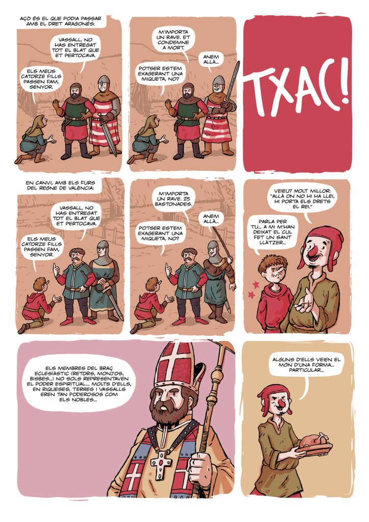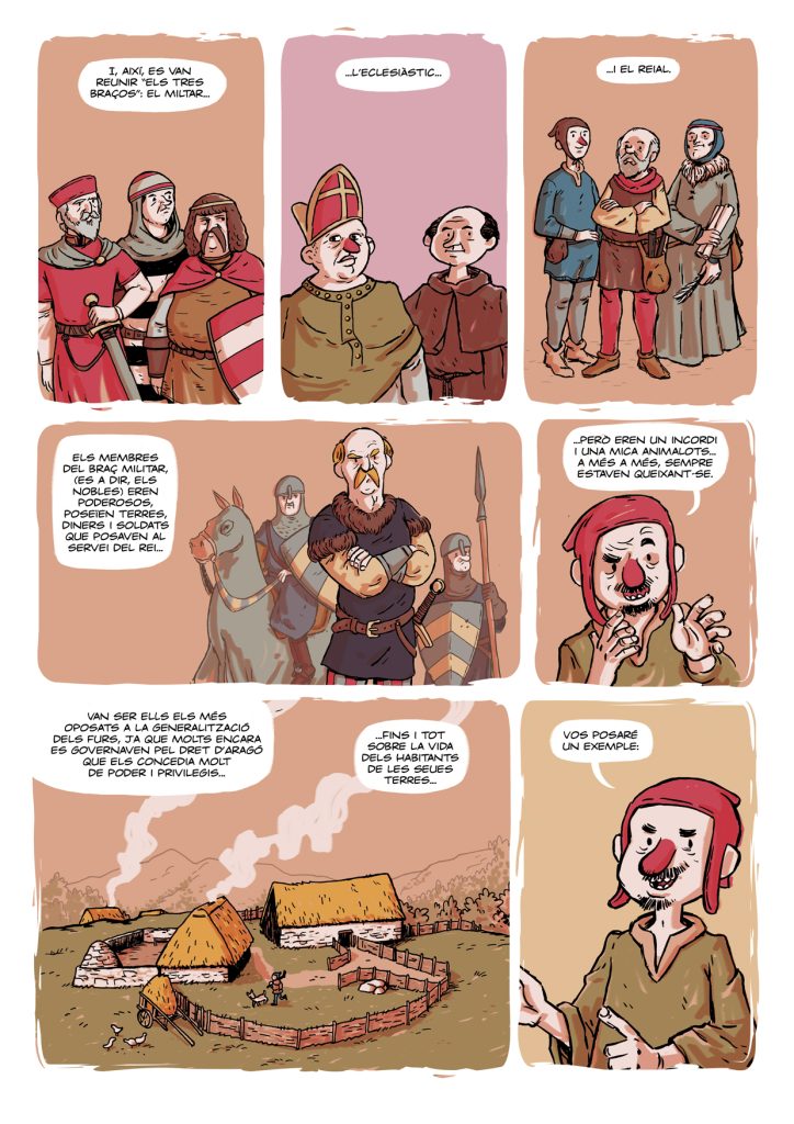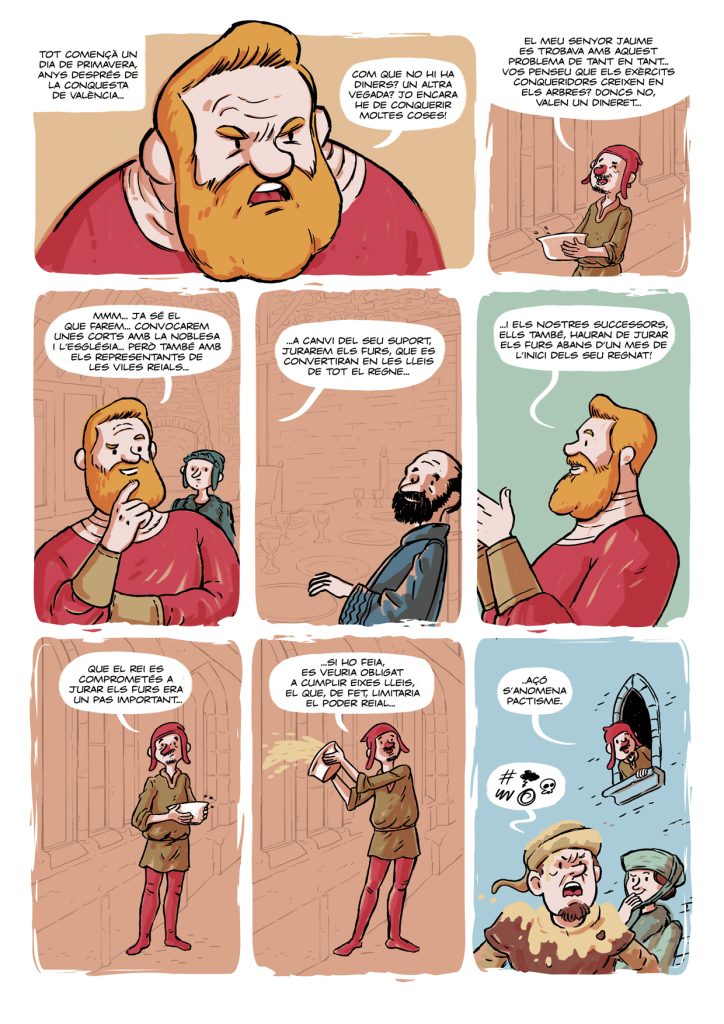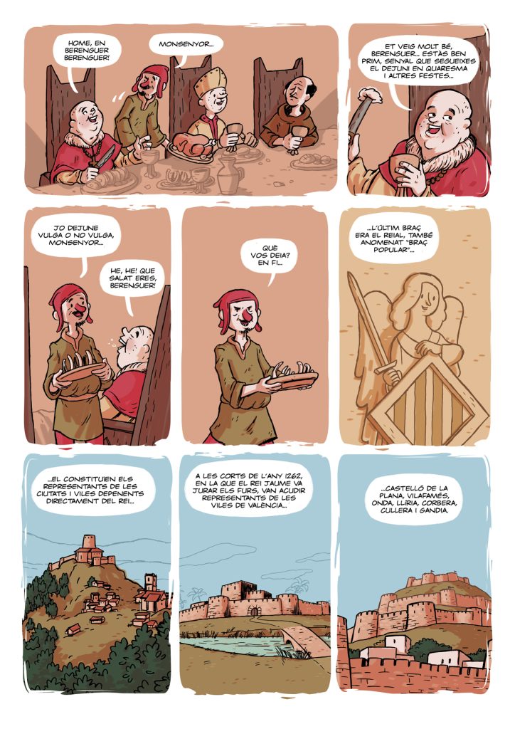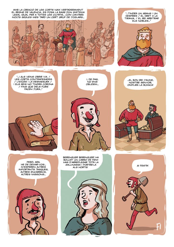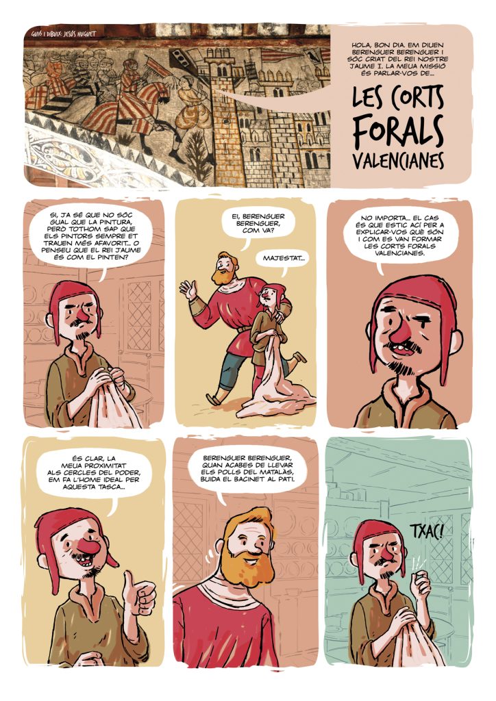 “Les Corts Forals Valencianes” és una de les històries que vaig guionitzar i dibuixar per al número especial de la revista Camacuc dedicat a les Corts Valencianes. Parla sobre Jaume I i la creació de les primeres Corts Valencianes. Aquesta vegada serà un dels vassalls de Jaume, en Berenguer Berenguer, qui ens farà de cicerone… Per cert, no us espanteu: en Berenguer Berenguer és una mica “especial”… Però millor comproveu-ho vosaltres mateixos…